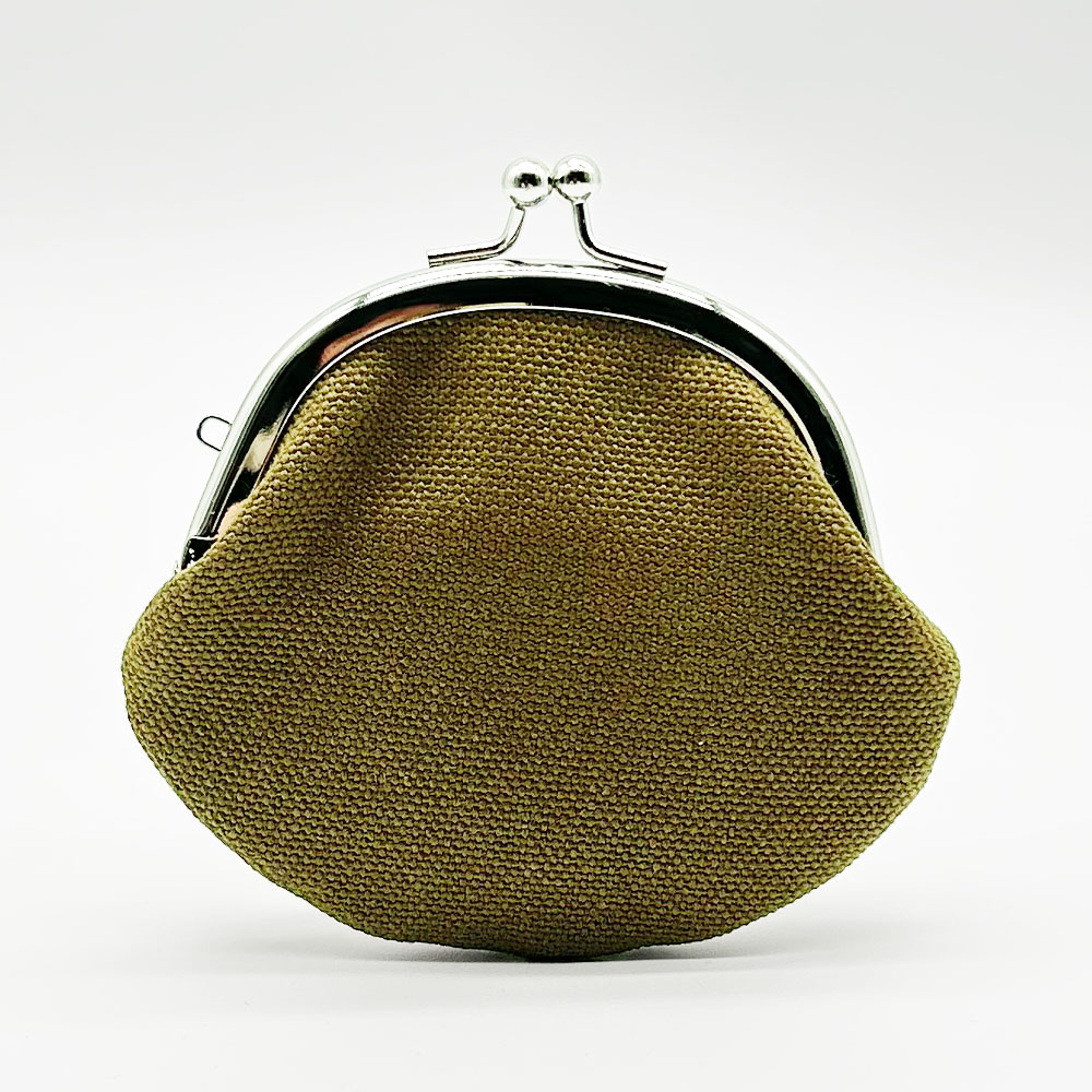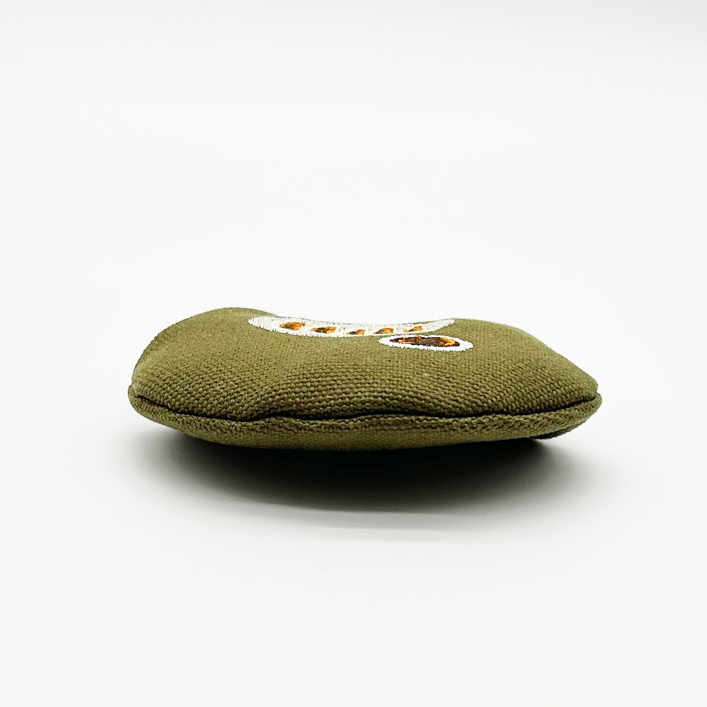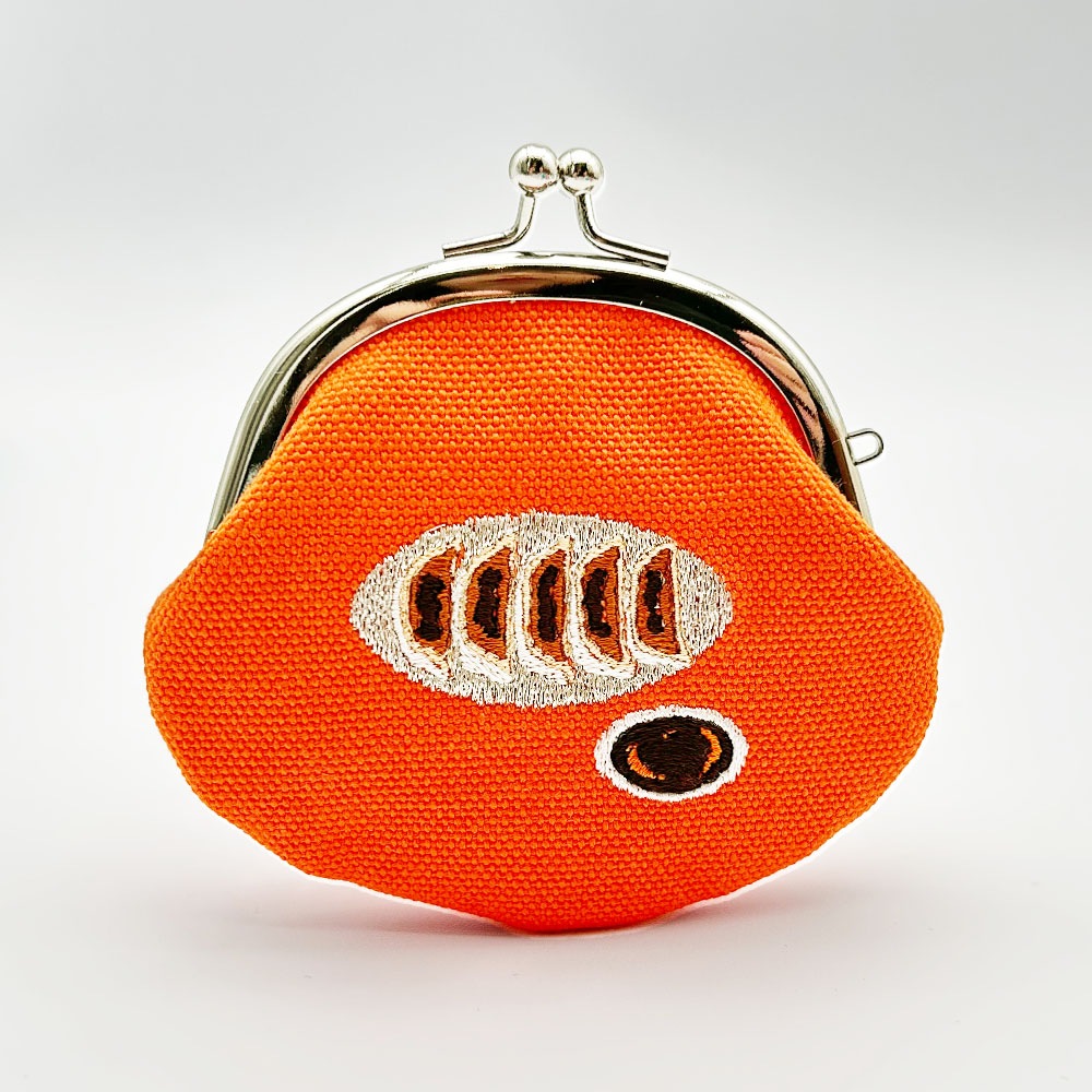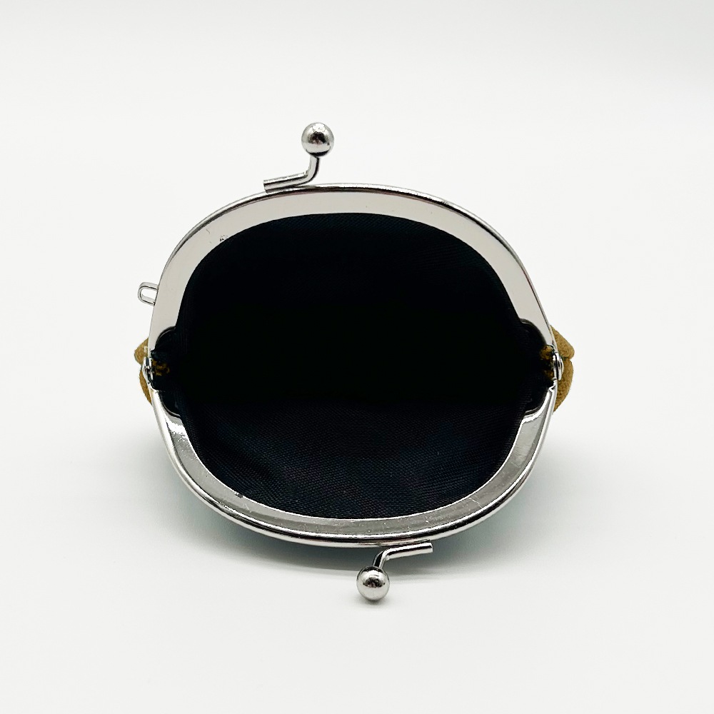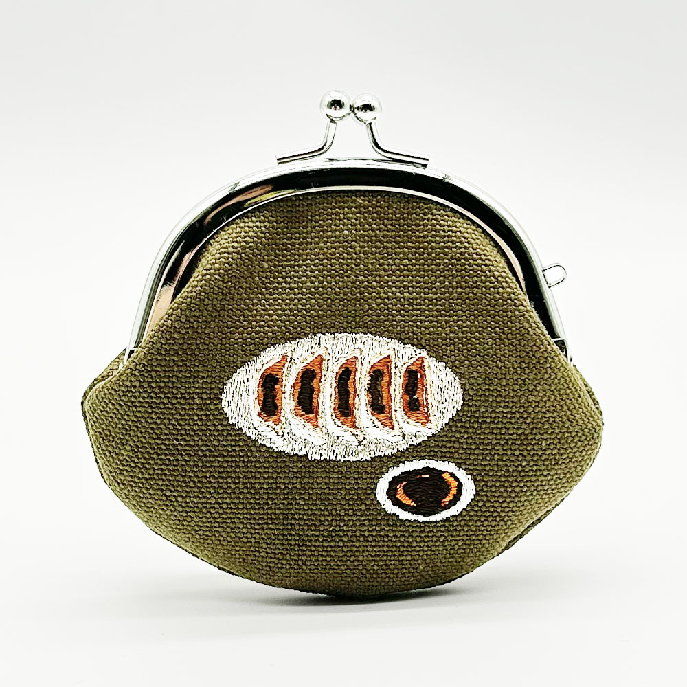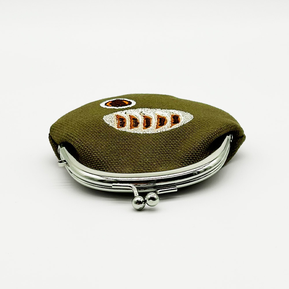 手のひらに収まるコロッとした形と、温かみのある刺繍が施されたがま口は見るたび癒しを感じることのできる一品です。