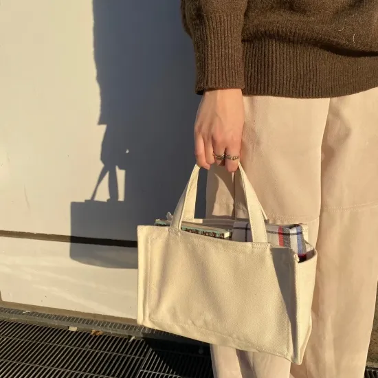 四角い形状のため自立性が高く、外出先などでテーブルや椅子などに直置きするシチュエーションでも形が崩れにくいのもポイントです。