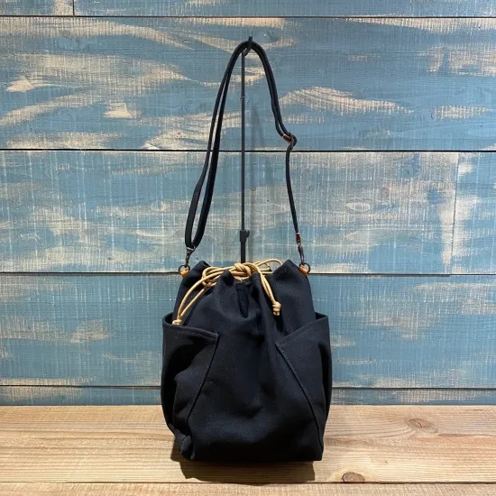 8号帆布と栃木レザーの革コンビのショルダーバッグは、丸い風船のようなシルエットがコーデのアクセントになります。