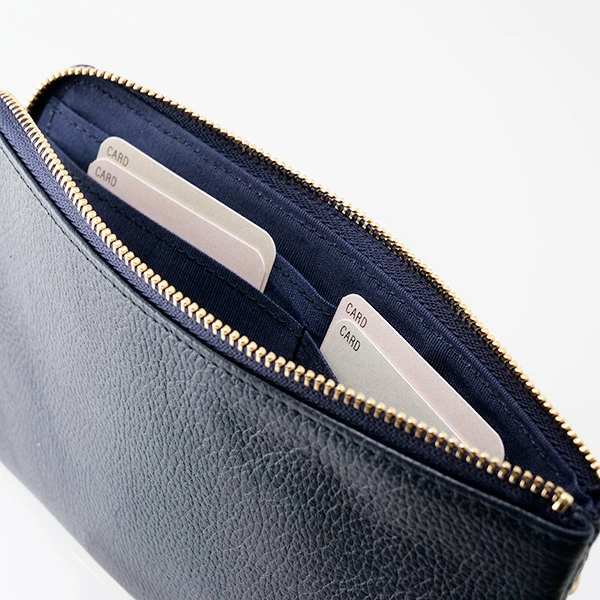 長財布のような横長タイプで、お札も折らずに収納でき、外側にファスナー付きの小銭入れを備えています。縦向きのカードポケットが2か所あり、ゆとりのある幅で各々複数枚を収納できます。カードポケットの上部に広口のフリーポケットもありレシートやクーポン、チケットなどを整理しておけます。