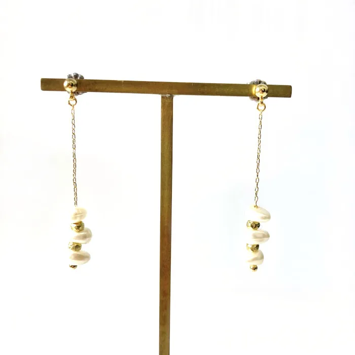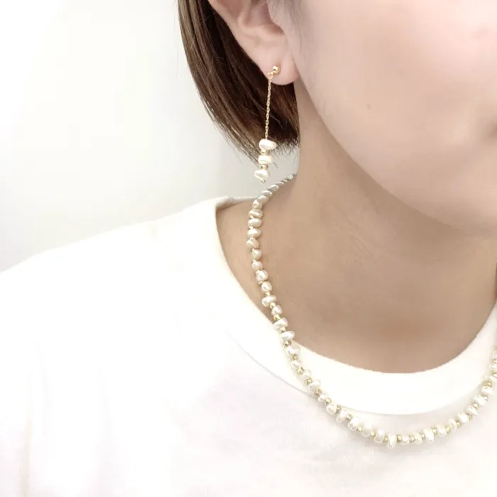 華奢なチェーンに3粒のライスパールとゴールドのビーズを通したピアス。