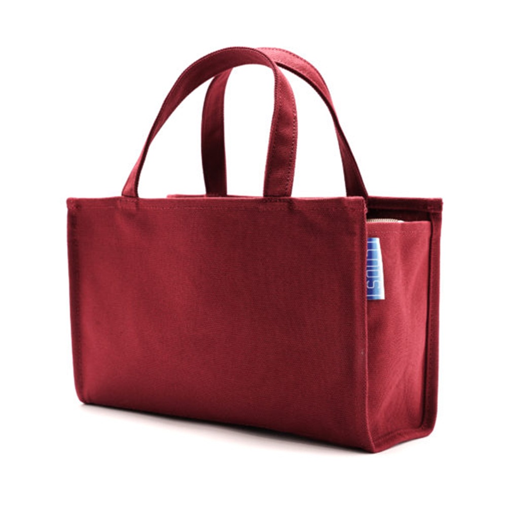 四角い形状のため自立性が高く、外出先などでテーブルや椅子に直置きするシチュエーションでも形が崩れにくいのもポイントです。