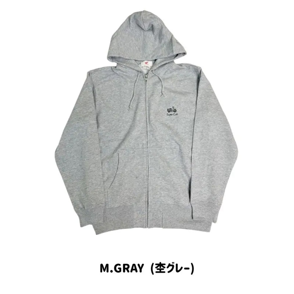 スーパーカブが、胸元にワンポイントとして刺繍されたシンプルなデザインのジップアップパーカー